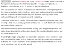 >A 23-year-old >severing her partner's left nipple (which she fed to a dog) >amputating his left ring finger with an axe >punching him repeatedly in the face >appearing in court wearing a fluffy panda-eared pajama set and slippers